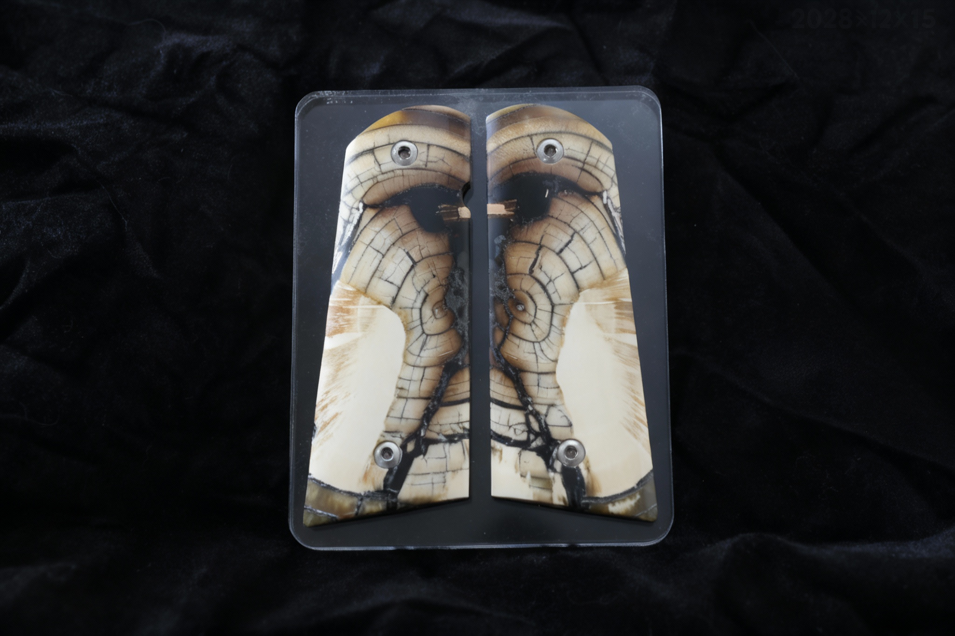 "Command attention with these peerless 1911 grips, expertly fashioned from rare mammoth crosscut ivory. Crafted by a master artisan boasting decades of experience, each pair is a testament to precision and exceptional skill. The striking crosscut pattern unveils the captivating, ancient grain of the mammoth ivory, creating a visual depth and character truly unlike any other. These grips are more than an upgrade; they are an heirloom-quality enhancement, imbuing your firearm with a distinct blend of natural grandeur and sophisticated craftsmanship."