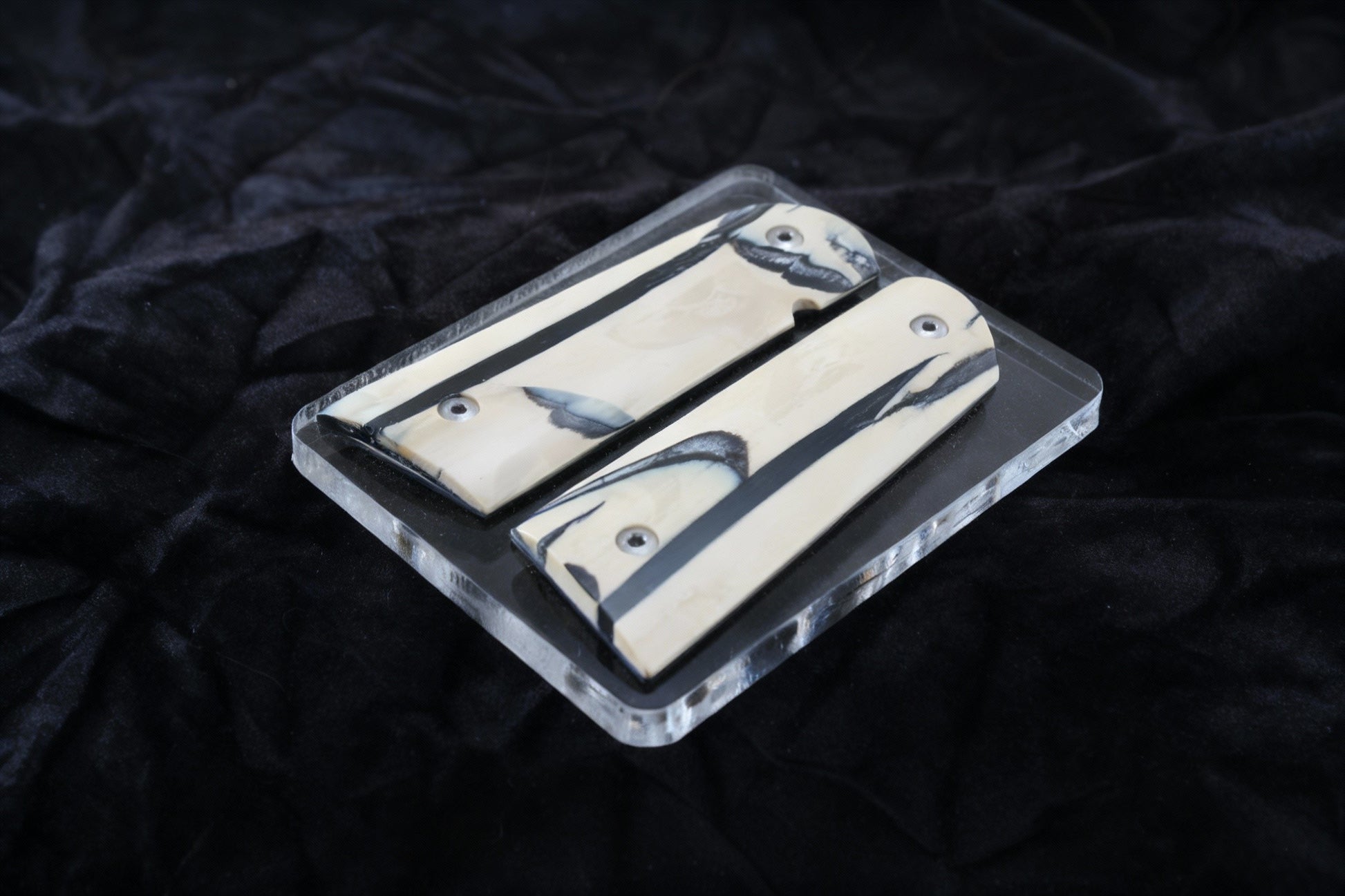 "Elevate your 1911 with these exceptional Mammoth Ivory grips, a testament to decades of master craftsmanship. Each pair is meticulously handcrafted by an artisan with unparalleled experience, ensuring a perfect fit and a truly unique aesthetic. Sourced from ancient mammoths, the ivory's natural beauty and organic character make these grips a distinctive luxury. Experience the blend of heritage and precision, adding an unmatched touch of elegance and history to your firearm."